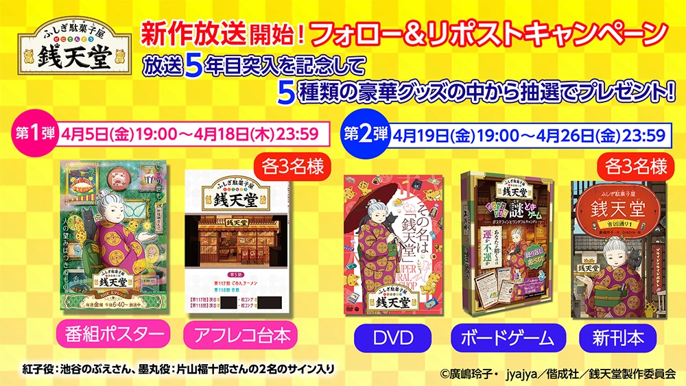 TVアニメ「ふしぎ駄菓子屋 銭天堂」では、公式X(旧Twitter)にてキャストサイン入りポスターなど、豪華賞品が当たるフォロー&リポストキャンペーンを実施中です。